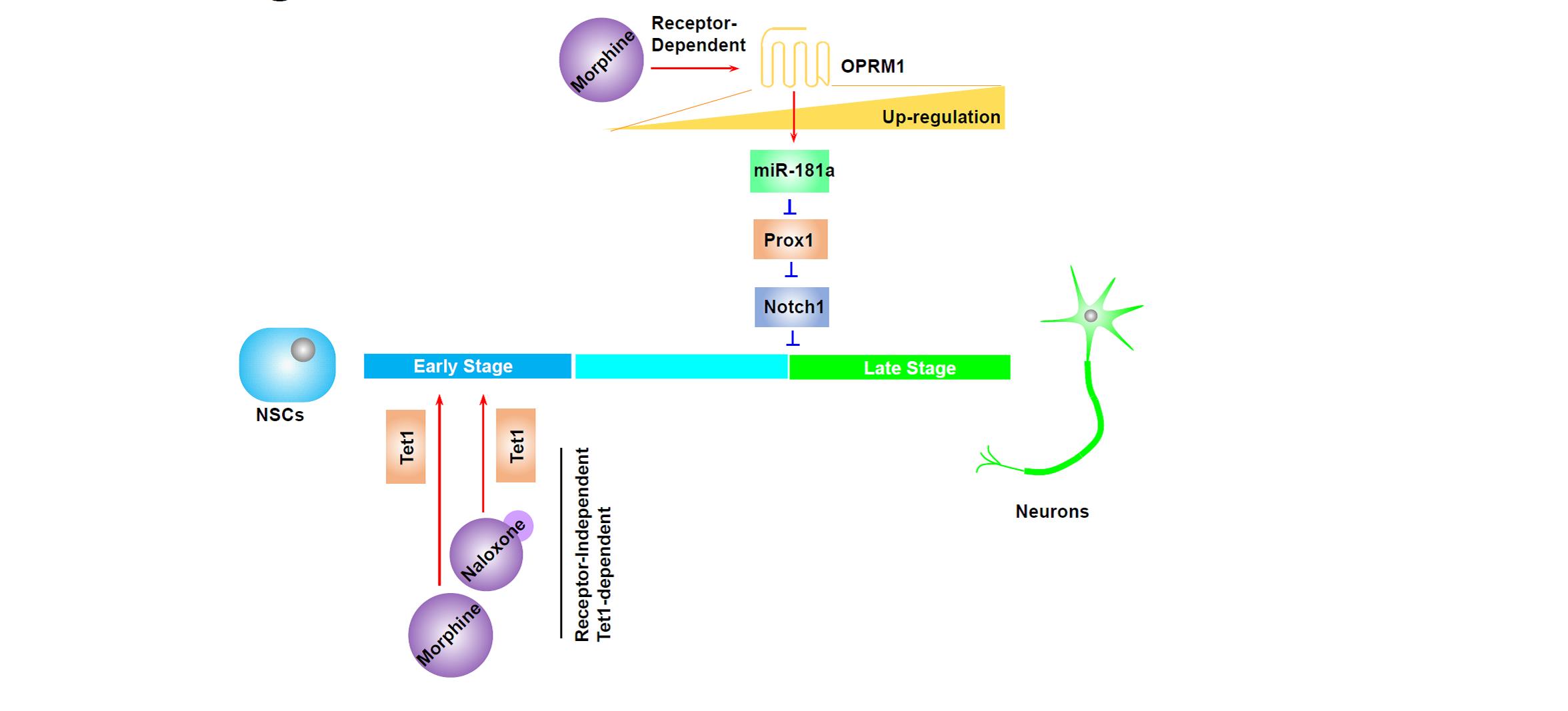 研究團隊以阿片受體拮抗劑納洛酮為代表研究了阿片類藥物調控NSCs分化的機制。發現在阿片受體及其內源配體表達極低的NSCs中,納洛酮通過進入細胞內促進NSCs向神經元分化,而喪失細胞膜穿透能力的納洛酮類似物納洛酮-碘甲氧化物則不能影響NSCs的分化方向。進一步的研究表明,納洛酮處理改變了細胞內TET1的DNA去甲基化能力和基因組DNA甲基化水平。隨后,研究組利用Tet1敲除的細胞,證明了納洛酮對NSCs分化的調控作用依賴于Tet1,而與同家族的Tet2或Tet3無關。此外,研究組還證實了其他阿片類藥物也可以通過非阿片受體途徑調控NSCs分化,比如在NSCs分化前期加入嗎啡同樣可以促進NSCs向神經元分化。