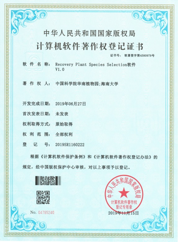 同時,科研人員基于R語言將模型開發出一個基于web的軟件平臺:Recovery Plant Species Selection軟件V1.0,該平臺已經申請獲得國家計算機軟件著作權,華南植物園為第一單位。