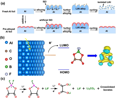 (a)通過同步預合金化以及構筑人造SEI膜提高鋁負極循環穩定性的機制;(b)DFOB-在鋁負極表面的還原機制以及DFOB-接受電子后的電荷差分圖;(c)DFOB-通過開環反應進行還原和聚合的機制