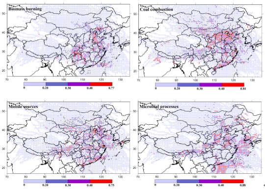 圖2. 五城市NOx燃煤源、移動源、生物質燃燒源與生物土壤源的源區分布特征
