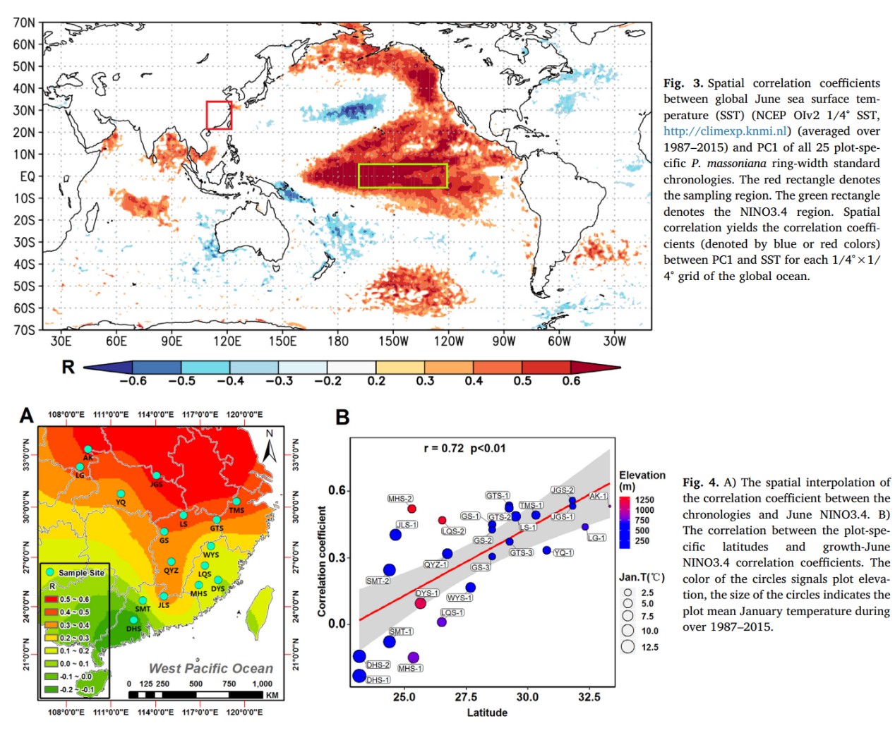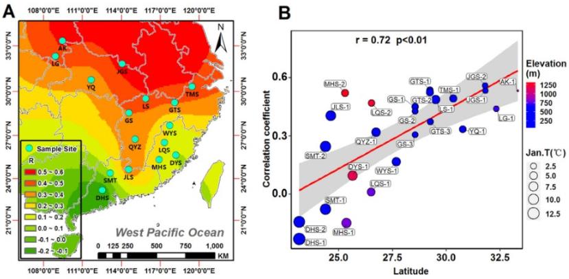馬尾松輪寬標準年表與當年 6 月 NINO3.4 指數相關系數的水平分布情況(A)及其與緯度的相關分析結果(B, 正相關,p<0.01)。樣方圓圈的大小代表對應年表在全樣方主成分分析中在主成分 1 上的載荷大小,圓圈的顏色代表對應樣方的海拔高度。