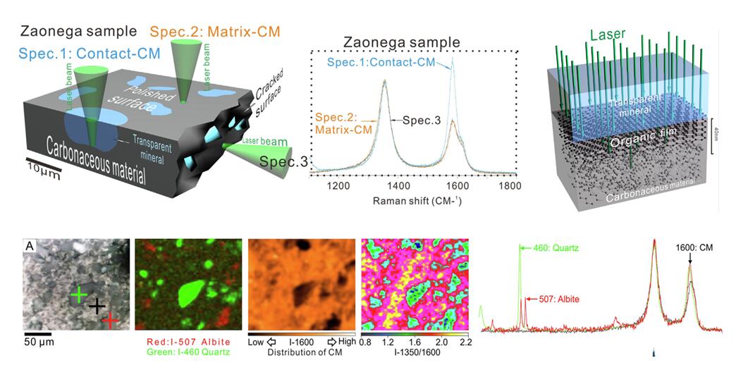 近日,地外海洋系統研究室屈原皋研究員及其團隊運用拉曼光譜學方法在古元古代(約20億年前)地層中發現熱液流體中有機分子以礦物為模板有序排列并在礦物表面組裝形成類似有機膜的結構。此過程中受溫度、壓強、礦物晶型、表面電荷等綜合因素影響,最終導致礦物表面有機膜的分子有序度不同。