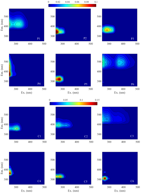 圖1. 平行因子識別的生物質開放燃燒、家用煤燃燒和機動車排放樣品的水溶性有機碳(WSOC,P1-6)和甲醇溶的有機碳(MSOC,C1-6)組分中的熒光成分圖