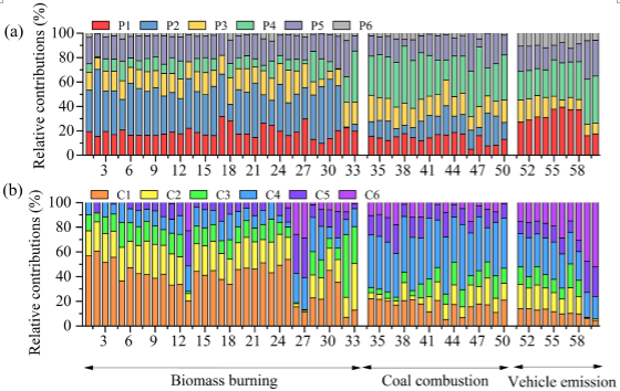圖2. 平行因子識別的生物質開放燃燒、家用煤燃燒和機動車排放樣品的水溶性有機碳(WSOC,a)和甲醇溶的有機碳(MSOC,b)組分中的相對熒光成分的貢獻