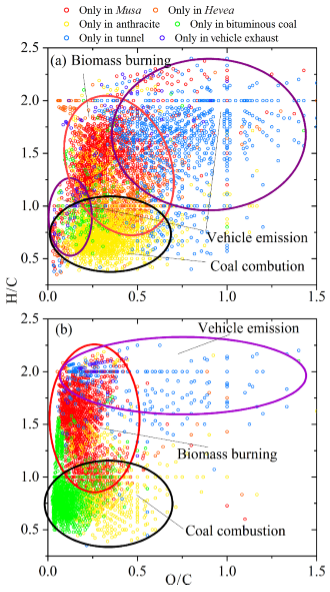 圖3. 維恩圖(Venn diagram)識別的生物質開放燃燒、家用煤燃燒和機動車排放樣品的水溶性有機碳(WSOC,a)和甲醇溶的有機碳(MSOC,b)中獨立分子化合物的范式圖(Van Krevelen)分布
