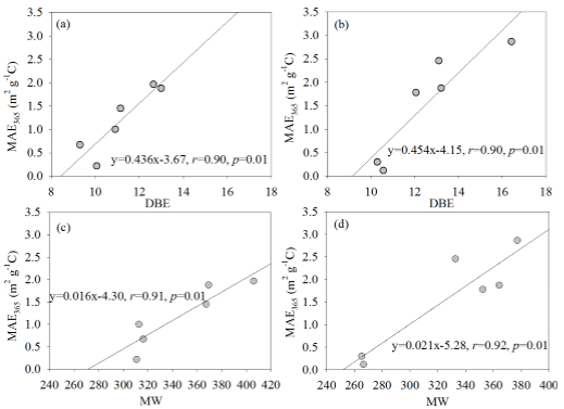 圖4. 可能BrC分子的等效雙鍵指數(DBE)和分子質量(MW)與水溶性有機碳(WSOC,a)和甲醇溶的有機碳(MSOC,b)組分的吸光能力(MAE365)之間的線性關系