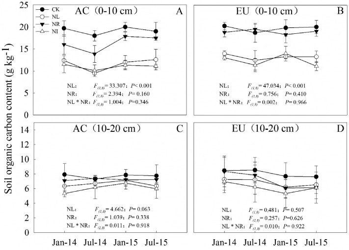 圖1. 凋落物和根系去除對土壤有機碳的影響