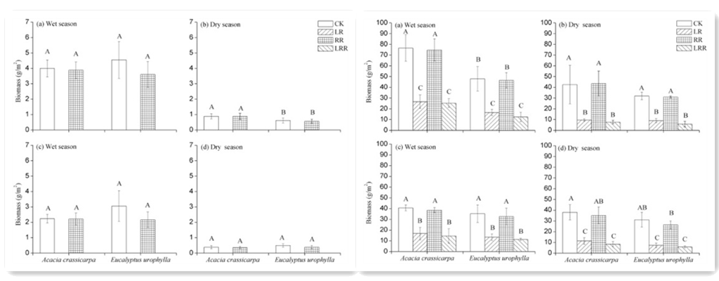中科院華南植物園恢復生態學團隊(PI:劉占鋒研究員)基于凋落物和根系去除野外控制實驗平臺,以南亞熱帶人工林(尾葉桉林和厚莢相思林)為研究對象,研究了長期凋落物和根系去除對土壤有機碳庫和土壤生物群落的影響。研究發現:(1)持續去除凋落物(6年)顯著降低了表層土壤(0-10cm)的有機碳含量,但是根系去除對土壤有機碳的效應不明顯;(2)凋落物去除顯著降低了表棲類蚯蚓(Amynthas sp.)和內棲類蚯蚓(Pontoscolex corethrurus)的密度和生物量,但是根系去除對兩類蚯蚓影響不顯著。研究結果表明,凋落物在調控土壤有機碳積累和土壤生物群落結構方面發揮的作用整體上要比根系大。研究結果不僅為揭示凋落物在亞熱帶人工林中生態功能提供了重要的實驗證據,對于人工林的可持續管理也具有重要的實踐指導意義。