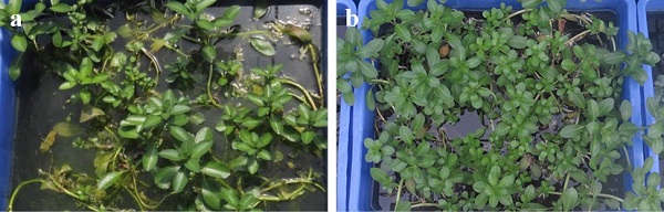 圖2 菱角在豬場養殖廢水生長狀況(a:第1天;B:第15天)