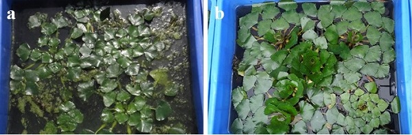 圖1 水龍在豬場養殖廢水生長狀況(a:第1天;B:第15天)