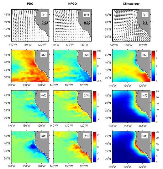 研究人員結合衛星遙感資料和走航觀測資料,基于物理—生態耦合模式在1993-2016年的模擬結果,發現中部加利福尼亞海域不僅具有顯著的季節性變化,還具有較強的年際變化(圖1)。從近岸上升流區到離岸大洋區,新生產力的關鍵調控機制有所不同,物理過程的調控作用逐漸減弱,而營養鹽的作用逐漸增強。此外,厄爾尼諾/拉尼娜事件(ENSO)主要通過局地風和海洋波動來影響近岸上升流、沿岸流及其營養鹽供給,進而影響新生產力;相對于物理變量以及營養鹽通量,新生產力對ENSO的響應在頻率上發生了偏移,這是由物理生態過程的非線性作用導致的(圖2)。結合回歸分析發現,北太平洋年代際振蕩(PDO)和北太平洋環流振蕩(NPGO)通過海盆尺度的風應力和上層海洋的層結來影響流場和垂向混合,進而影響營養鹽和新生產的時空格局(圖3)。