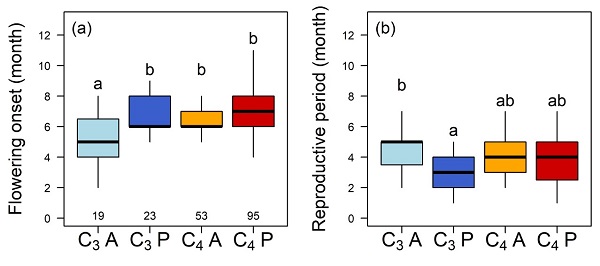 南亞熱帶禾本科190個(gè)物種的生殖物候性狀比較。C3A:一年生C3植物;C3P:多年生C3植物;C4A:一年生C4植物;C4P:多年生C4植物。取樣量在(a)中箱線(xiàn)下方,四組開(kāi)花開(kāi)始時(shí)間(flowering onset)和生殖期長(zhǎng)短(reproductive period)多重比較的結(jié)果以字母標(biāo)于箱線(xiàn)上方(字母不同表示差異顯著)。