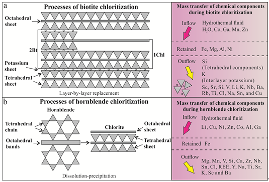 斑巖銅礦角閃石和黑云母綠泥石蝕變過程中元素遷移規律示意圖