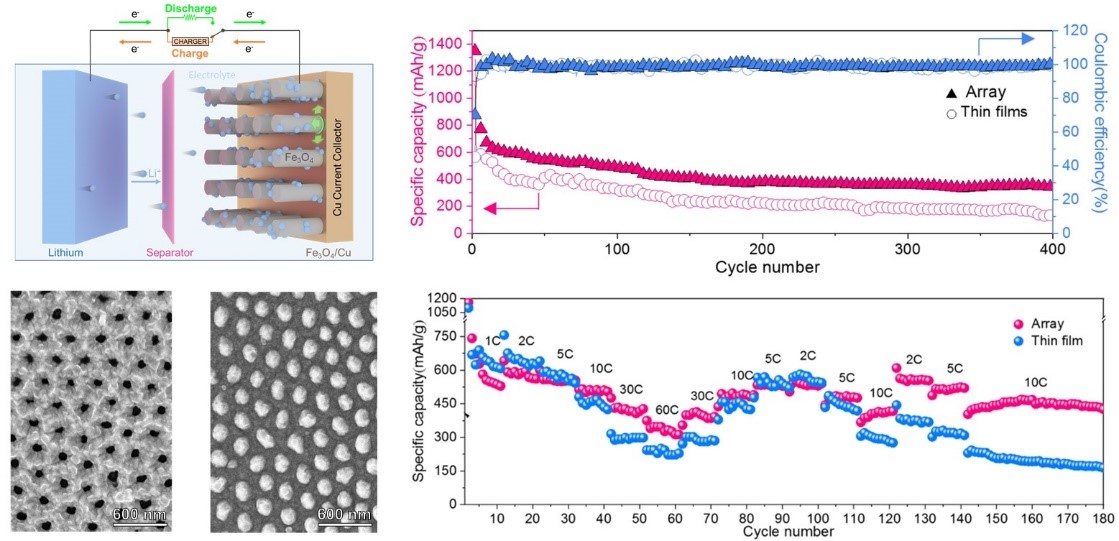 鋰離子電池的轉(zhuǎn)換型電極在充放電過程中通常存在體積變化大、與集流體接觸不良、循環(huán)過程中積累內(nèi)部鈍化等問題,容易發(fā)生容量的快速衰減,同時也較難實現(xiàn)高倍率的充放電,嚴重限制了轉(zhuǎn)換型電極的實際應(yīng)用。釋放電化學(xué)反應(yīng)過程中電極的內(nèi)應(yīng)力、緩解內(nèi)部鈍化成為了轉(zhuǎn)換型電極成功應(yīng)用的關(guān)鍵。基于此,深圳先進院功能氧化物材料與器件研究團隊采用脈沖激光沉積法(PLD)在Cu集流體上直接生長Fe3O4納米陣列,用于鋰離子電池負極材料,有效地解決了傳統(tǒng)轉(zhuǎn)換型電極材料電化學(xué)反應(yīng)過程中結(jié)構(gòu)破壞、接觸失效和內(nèi)部鈍化等問題。Fe3O4納米陣列電極在電化學(xué)循環(huán)過程中保持了穩(wěn)健的結(jié)構(gòu)和完整的界面,提升了鋰離子電池的循環(huán)壽命,同時可實現(xiàn)60C的高倍率性能,為轉(zhuǎn)換型電極的優(yōu)化提供依據(jù)。