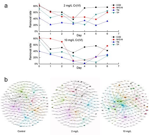 圖 (a) 重金屬鉻影響下營養(yǎng)鹽轉(zhuǎn)化效率變化;(b) 重金屬鉻影響下氮代謝途徑基因與微生物類群共現(xiàn)模式的網(wǎng)絡分析