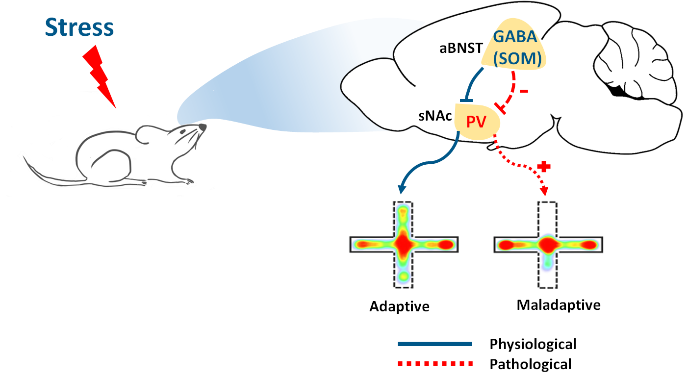 隨著社會的變遷,生活節奏的加快,人們面臨越來越多的壓力應激。壓力應激是應對環境變化的一種生理適應性反應,但是長期暴露則會產生病理改變,導致焦慮癥甚至抑郁癥等出現。然而,目前針對壓力應激引起的焦慮樣行為的大腦神經環路的機制尚不清楚。 越來越多的臨床證據表明,焦慮癥和成癮是兩類高度并發的精神疾病,但是其內在的神經環路機制一直沒有被徹底研究。終紋床核(Bed Nucleus of the Stria Terminalis , BNST)是壓力應激反應中的關鍵腦區。最近有關人的成癮研究證明了BNST在戒斷相關的焦慮和復吸中的作用,提示該壓力反應腦區和大腦獎賞系統之間存在內在聯系。伏隔核(Nucleus accumbens, NAc)是獎賞系統中的重要組成部分,它會對壓力應激作出響應,并在焦慮調節中起主要作用。