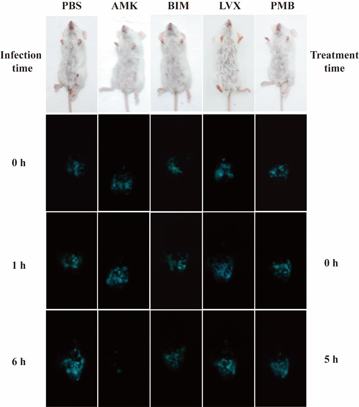 圖1、自主發(fā)光銅綠假單胞菌感染小鼠采用不同藥物治療后活體成像