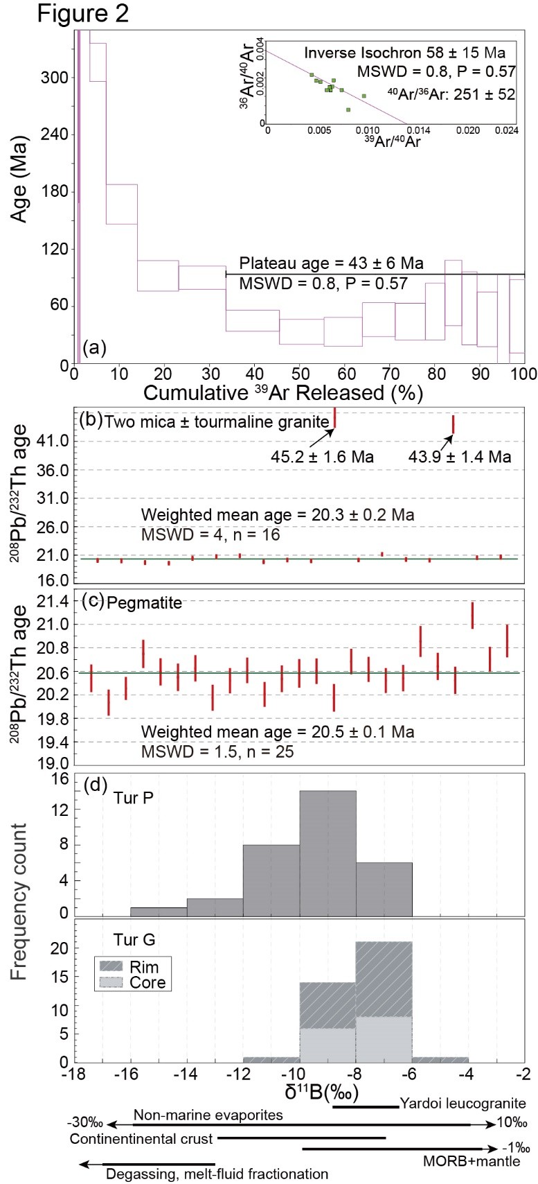 3)對偉晶巖中的電氣石進(jìn)行Ar-Ar定年,得到其年齡結(jié)果為45Ma(圖2),清楚的顯示了電氣石和偉晶巖不同期,并據(jù)此提出“捕獲電氣石”的概念,即電氣石與包含它的巖體僅僅只是空間上的共生,而無成因上的聯(lián)系。背后的理論支持在于電氣石具有比較高的封閉溫度(580-700℃以上),而偉晶巖的結(jié)晶溫度最低甚至可能僅僅為490℃,這樣的溫度不足以對電氣石構(gòu)成化學(xué)改造。