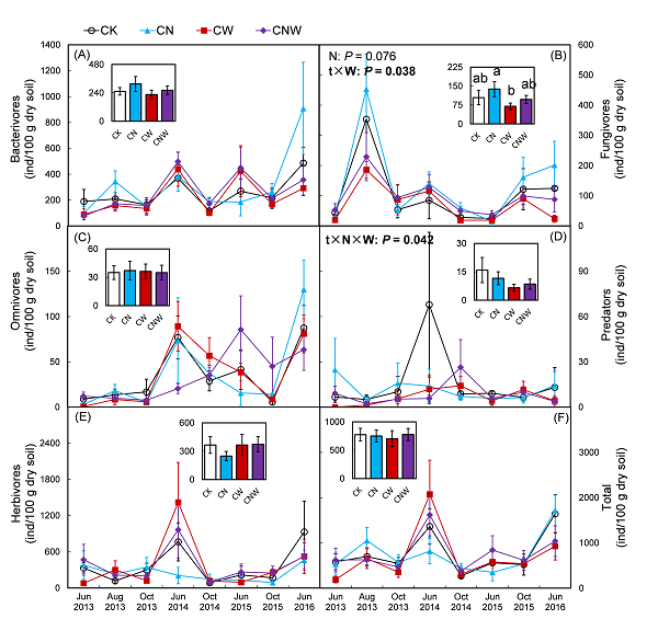 氮添加(CN),增雨(CW)和同時加氮增雨(CNW)對土壤線蟲各類群個體密度的影響