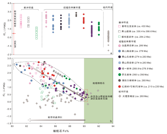 (a) 中亞造山帶俯沖及碰撞后伸展階段、及板內環境鎂鐵-超鎂鐵質巖體母巖漿氧逸度對比;(b)母巖漿氧逸度與橄欖石Fo值關聯圖。黑色虛線框為中亞造山帶鎂鐵-超鎂鐵質巖體,紅色虛線框代表了地幔源區氧逸度范圍。該圖顯示隨著橄欖石Fo值降低,巖體母巖漿的氧逸度逐漸升高,與板內環境巖體母巖漿氧逸度的變化趨勢明顯不同。