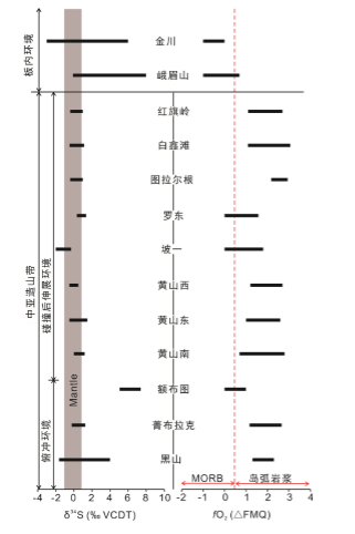 圖2 中亞造山帶鎂鐵-超鎂鐵質巖體中硫化物的δ34S值和母巖漿氧逸度與金川巖體和峨眉山大火成巖省中含礦巖體的對比