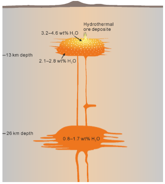 對于巖漿-熱液型礦床,水含量這一巖漿參數具有十分重要的成礦意義。盡管礦床的形成是從巖漿源區到流體階段一系列地質過程共同作用的結果,但淺部巖漿房的流體出溶被普遍認為是最為重要的金屬富集環節,因為高的流體/熔體分配系數使得有用金屬在出溶的流體中富集數十倍乃至上百倍。高含水量的巖漿更易于發生流體的飽和和出溶,所以富水的弧巖漿更易于形成巨大規模的巖漿-熱液型礦床。除了俯沖帶,在其他構造背景下同樣可以形成巖漿-熱液型礦床,例如位于北美中部的Climax型斑巖Mo礦,則形成在陸內裂谷的環境。不同于俯沖帶,其他構造背景(例如弧后盆地和陸內裂谷)的初始巖漿往往具有非常低的水含量(<2.0 wt%)。巖漿富水(>4.0 wt%)是形成巖漿-熱液型礦床的前提,那么在這種低含水量的巖漿系統如何形成熱液型礦床?
