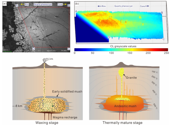 針對以上科學問題,廣州地化所同位素地球化學國家重點實驗室巖石學學科組博士后周金勝和王強研究員與中國地質科學院礦產資源研究所楊竹森研究員及其合作者在西藏岡底斯帶納如松多火山巖區(圖1),識別出高分異成因的花崗巖并揭示了其從淺部巖漿儲庫抽離的過程和機理。首先,該研究還原了與花崗巖時代相近的中酸性火山巖噴發前的巖漿過程,特殊的礦物組合(角閃石+石英)、平衡熔體成分、Rhyolite-MELTS模擬和粘度計算表明(圖2),在上地殼(~8km古深度)存在與花崗巖同期的巖漿儲庫。并確證花崗巖是從該巖漿儲庫通過分異形成,主要證據包括:(1)花崗巖與火山巖時代相近,且花崗巖中存在與火山巖年齡一致的鋯石循環晶;(2)花崗巖存在顯著的高分異地化信號,例如強的Eu異常、低的Zr/Hf比值。在花崗巖中還發現有石英的熱反還帶(圖3),指示熱的巖漿補給可能觸發了高分異熔體的分離。另外,除了眾所周知的H2O,揮發分F可能促進了殘余熔體的匯聚與抽取。研究結果表明,在長時期(數個百萬年)活躍的巖漿系統的演化晚期,當上地殼處于熱成熟的階段,淺部巖漿儲庫可以通過晶體-熔體分離形成高分異花崗巖。