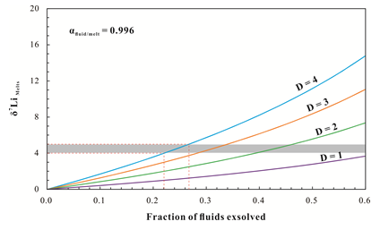 圖3 流體出溶過程Li同位素瑞利分餾模擬