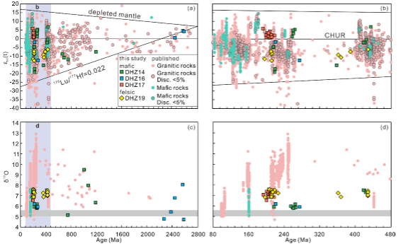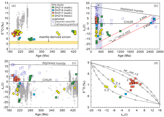 研究獲得以下認識:(1)道縣下地殼存在鎂鐵質麻粒巖和長英質麻粒巖(圖1a),鎂鐵質麻粒巖其原巖來自于地幔源區的部分熔融,長英質麻粒巖原巖來源于地殼源區熔融;(2)鎂鐵質和長英質麻粒巖捕虜體均記錄了相似并且連續的巖漿活動年齡(226–218 Ma)和變質作用年齡(218–193 Ma),指示了它們的成因聯系,玄武質巖漿底侵作用形成鎂鐵質麻粒巖的同時導致了先存下地殼的部分熔融并最終形成長英質麻粒巖;(3)麻粒巖捕虜體的繼承鋯石顯示了太古代-新元古代(2584–659 Ma)、早古生代(峰期年齡約425 Ma)和晚古生代(峰期年齡約261 Ma)等多期巖漿活動年齡,并具有明顯不同的Hf–O同位素組成(圖2),記錄了華夏地塊下地殼的多階段演化過程,晚太古代和晚古生代具明顯的地殼增生特征,新元古代和早古生代主要為地殼重熔再造,而早中生代的地殼增生伴隨了地殼再造。