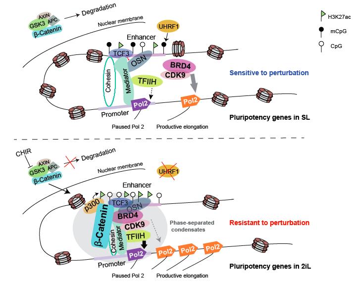 2020年7月17日,中國(guó)科學(xué)院廣州生物醫(yī)藥與健康研究院Miguel A. Esteban實(shí)驗(yàn)室和以色列魏茨曼科學(xué)研究院Jacob H. Hanna實(shí)驗(yàn)室及武漢大學(xué)陳亮實(shí)驗(yàn)室的研究人員合作在Science Advances在線(xiàn)發(fā)表了文章‘β-Catenin safeguards the ground state of mouse pluripotency by strengthening the robustness of the transcriptional apparatus’。該研究發(fā)現(xiàn)在基態(tài)多能干細(xì)胞中,激活的β-catenin通過(guò)在多能性位點(diǎn)招募輔調(diào)控因子促進(jìn)多能性基因的轉(zhuǎn)錄起始,減少了對(duì)BRD4/CDK9調(diào)控的暫停釋放的依賴(lài),但是對(duì)抑制轉(zhuǎn)錄起始更敏感,從而解釋了基態(tài)多能干細(xì)胞在面臨外界擾動(dòng)時(shí)更穩(wěn)定的原因。但與此同時(shí),胚胎多能干細(xì)胞的細(xì)胞周期相關(guān)的基因仍然高度依賴(lài)暫停釋放機(jī)制進(jìn)行轉(zhuǎn)錄,因此兩種條件下的胚胎多能干細(xì)胞的增殖均對(duì)抑制BRD4/CDK9敏感。