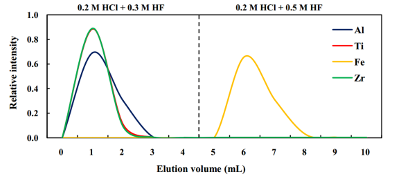 針對上述問題,中國科學院廣州地球化學研究所穩定同位素地球化學學科組博士生朱冠虹和高級工程師馬金龍等通過一系列條件實驗,對不同巖性的巖石標樣的淋洗曲線進行了標定,最終開發了一種快速、高效的鐵同位素分析方法。該分析方法僅采用1柱AGMP-50陽離子交換樹脂,先用0.2 N HCl+0.3N HF作為淋洗液去除Al及其他高場強元素(HFSE),再用0.2 N HCl+0.5N HF作為淋洗液接收Fe,就可以將Fe和其它基體元素(Al、Na、Mg、K、Ca、Cu等)完全分離開(圖1)。采用該分析流程對不同巖性的巖石標樣和結殼標樣進行Fe的分離純化,并對其Fe同位素組成進行了測定,所有標樣的Fe同位素分析結果與國際推薦值在誤差范圍內完全一致,證明了該分析流程的準確性和可靠性。相對于已報道的Fe同位素分析方法,該分析方法不僅快速、高效,而且適用性廣。該分析流程不僅適用于不同巖性的巖石樣品,也適用于高銅含量的地質樣品。