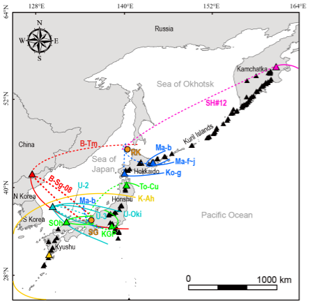 圖1. 東亞全新世關(guān)鍵火山灰層的源區(qū)和分布