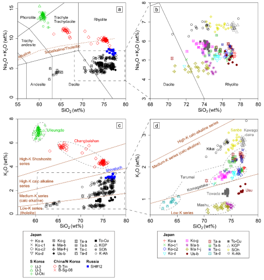 研究發(fā)現(xiàn),地層框架內(nèi)的火山灰具備特征的地球化學(xué)組成(圖2)。例如:日本火山灰為低鉀和中鉀系列,主要為流紋質(zhì)。俄羅斯火山灰為中鉀流紋質(zhì),但因具有更高的鉀和更低的鈣而可以與日本火山灰相區(qū)分。韓國火山灰具有獨(dú)特的高鉀響巖-粗面質(zhì)組分,而中國/朝鮮的火山灰則為高鉀粗面-流紋質(zhì)??偨Y(jié)起來,框架內(nèi)不同火山的產(chǎn)物可以通過主量元素區(qū)分,但同一火山不同期次的噴發(fā)產(chǎn)物,則還需利用年代學(xué)/地層學(xué)證據(jù)加以區(qū)分。