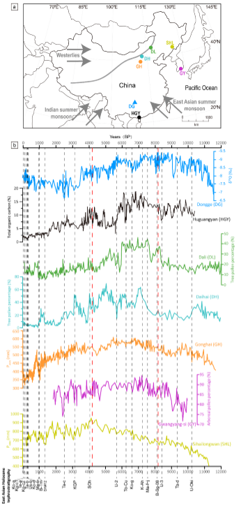 圖3. 東亞全新世火山灰地層框架與區(qū)內(nèi)高分辨率古氣候記錄