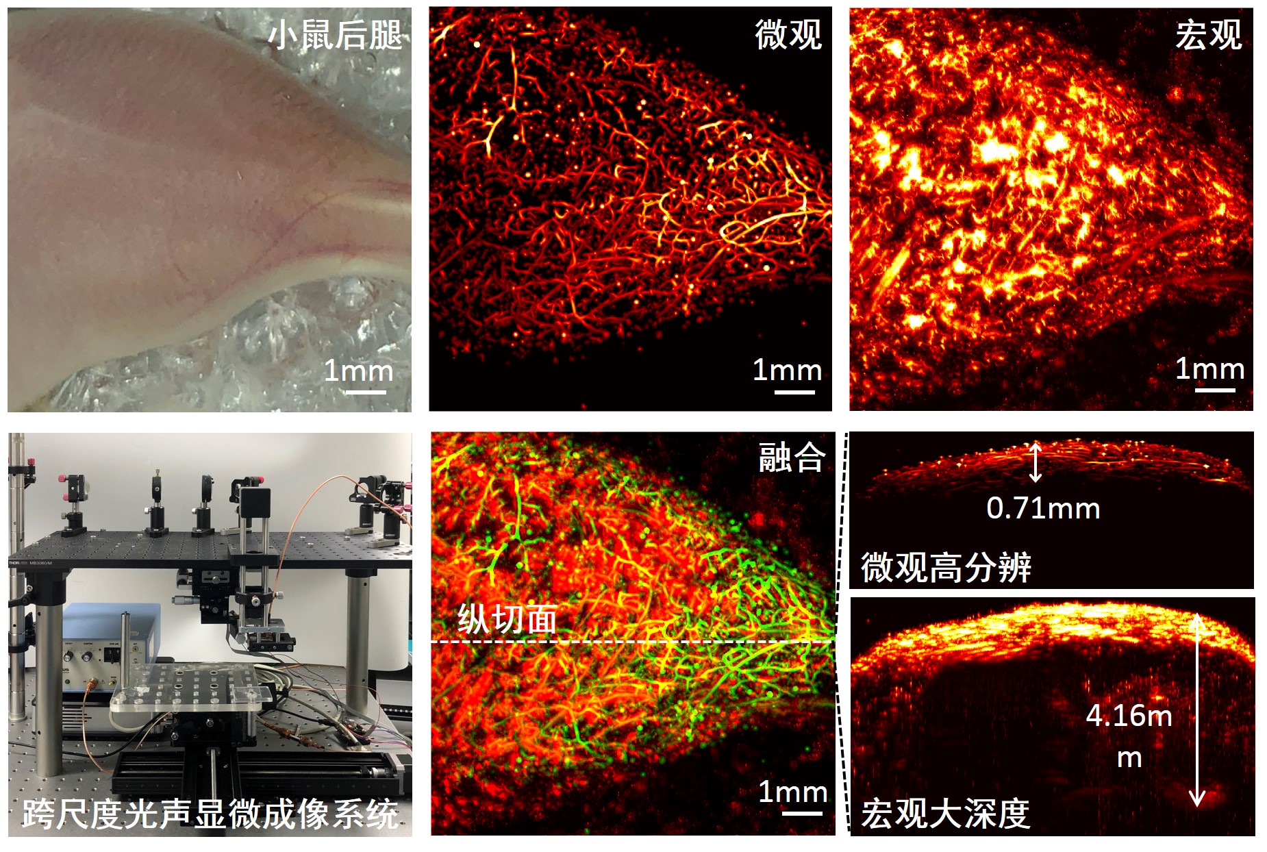 近日,中國科學院深圳先進技術研究院醫工所生物醫學光學與分子影像研究室宋亮研究員、劉成波副研究員團隊與美國德克薩斯A&M大學Jun Zou教授團隊合作,研制出基于自由空間光傳輸和MEMS高速掃描成像的跨尺度光聲顯微成像技術,實現了相同時間尺度,活體小動物從微觀到宏觀的跨尺度無創高速成像。成果論文Multiscale high-speed photoacoustic microscopy based on free-space light transmission and a MEMS scanning mirror發表在美國光學學會主辦的光學領域知名經典期刊Optics Letters。