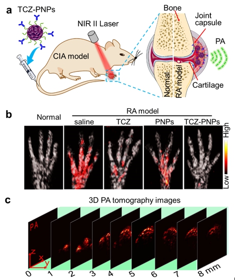 a. 小鼠類風濕性關節炎的成像和治療示意圖;b. 小鼠類風濕性關節炎足爪光聲診斷影像;c. 小鼠類風濕性關節炎足爪三維斷層掃描圖像。