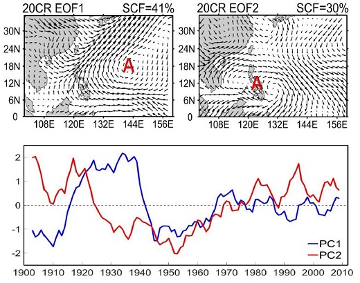 圖1 西北太平洋異常反氣旋的年代際兩個(gè)模態(tài)