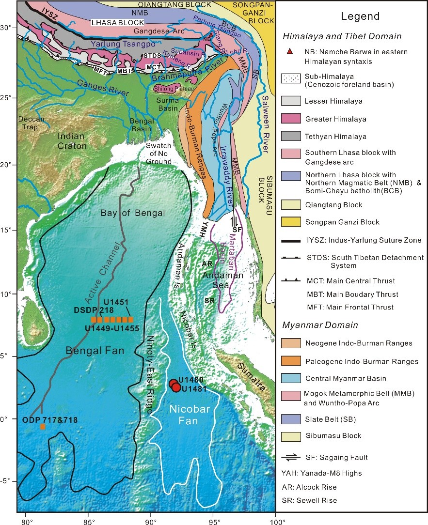 喜馬拉雅東構(gòu)造結(jié)是地球上構(gòu)造活動最強烈、巖石隆升和剝露速率最快(高達10mm/yr)的地區(qū)之一,而且雅魯藏布江在這里發(fā)生了急劇的轉(zhuǎn)折(圖1)。關(guān)于東構(gòu)造結(jié)的快速剝露,一般認為是由印度大陸東北拐角向北擠入歐亞板塊的構(gòu)造作用直接造成的。近年來流行的“構(gòu)造動脈瘤”(tectonic aneurysm)模型(e.g. Zeilter et al., 2001)則強調(diào)構(gòu)造與侵蝕之間的耦合作用,將東構(gòu)造結(jié)的快速剝露歸因于雅魯藏布大峽谷的下切侵蝕。該模型還認為,東構(gòu)造結(jié)的快速剝露是由布拉馬普特拉河對雅魯藏布江的襲奪貫通觸發(fā)的。然而,目前無論是雅魯藏布江-布拉馬普特拉河的貫通時間,還是東構(gòu)造結(jié)快速剝露的開始時間都存在爭議。位于東北印度洋的孟加拉-尼科巴深海扇體系作為雅魯藏布江-布拉馬普特拉河的最終沉積區(qū),是了解喜馬拉雅東段水系演化和隆升剝露歷史的重要窗口。