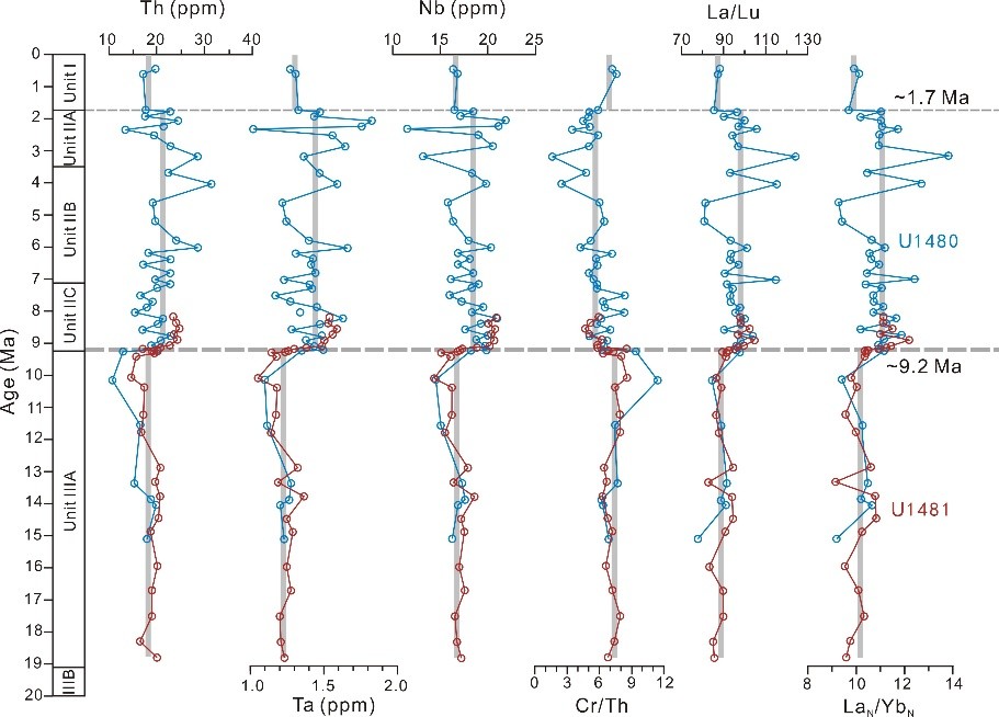 國際大洋發(fā)現(xiàn)計劃(IODP)362航次在尼科巴扇U1480和U1481站位成功鉆取了早中新世(~19Ma)以來的沉積物(圖1)。中國科學院邊緣海與大洋地質(zhì)重點實驗室大陸邊緣構(gòu)造學科組陳文煌助理研究員、閆義研究員及其合作者在航次生物地層學和沉積學等工作基礎(chǔ)上,運用微量元素和Sr-Nd同位素對尼科巴扇沉積物進行了詳細的物源分析(圖2,3,4)。