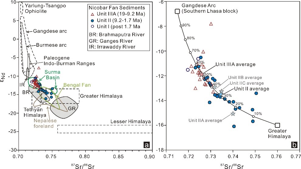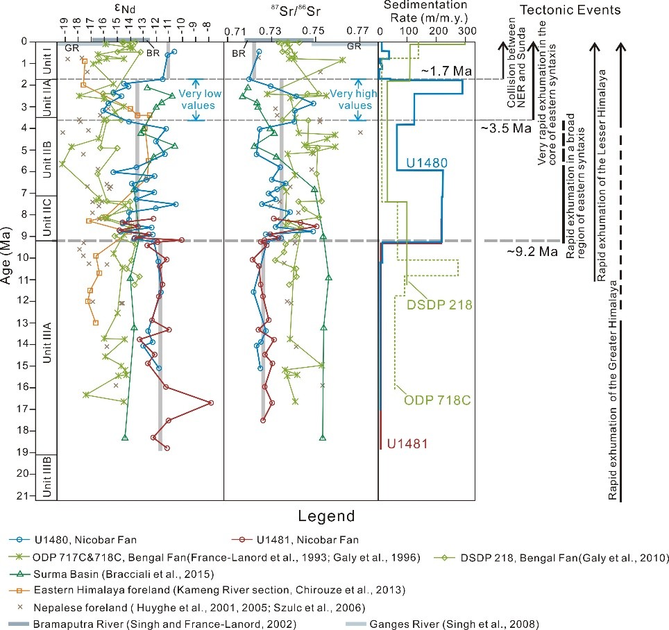 研究獲得以下重要認識:(1)尼科巴扇沉積物Sr-Nd同位素組成類似于布拉馬普特拉河現(xiàn)代沉積物的特征,指示以大喜馬拉雅結(jié)晶巖系為主的源區(qū),同時具有顯著的岡底斯弧來源(圖4),說明尼科巴扇沉積物主要經(jīng)由布拉馬普特拉河搬運自喜馬拉雅東段,受恒河來源沉積物的影響較小。(2)尼科巴扇下部(Unit IIIA)沉積物的地球化學和Sr-Nd同位素特征(圖2,3,4)顯示岡底斯弧物質(zhì)的長期連續(xù)輸入,說明雅魯藏布江-布拉馬普特拉河最晚在早中新世(~19Ma)就已貫通。(3)基于尼科巴扇的沉積速率和源區(qū)變化,本研究支持喜馬拉雅東構(gòu)造結(jié)的兩階段快速剝露模式。伴隨著沉積速率在~9.2Ma的快速增加,尼科巴扇沉積物地球化學和同位素組成在此時也發(fā)生了急劇變化(圖2,3),暗示了大喜馬拉雅結(jié)晶巖系物質(zhì)的增加,對應于東構(gòu)造結(jié)及其周邊區(qū)域快速剝露的開始。在3.5–1.7Ma,尼科巴扇沉積物具有低εNd值和高87Sr/86Sr比值,同時沉積速率達到頂峰(圖3),指示了大喜馬拉雅結(jié)晶巖系物質(zhì)的再次增加,對應于東構(gòu)造結(jié)核部(南迦巴瓦地體)自~3.5Ma起的快速剝露。該兩階段剝露模式仍需碎屑礦物熱年代學工作的進一步驗證。