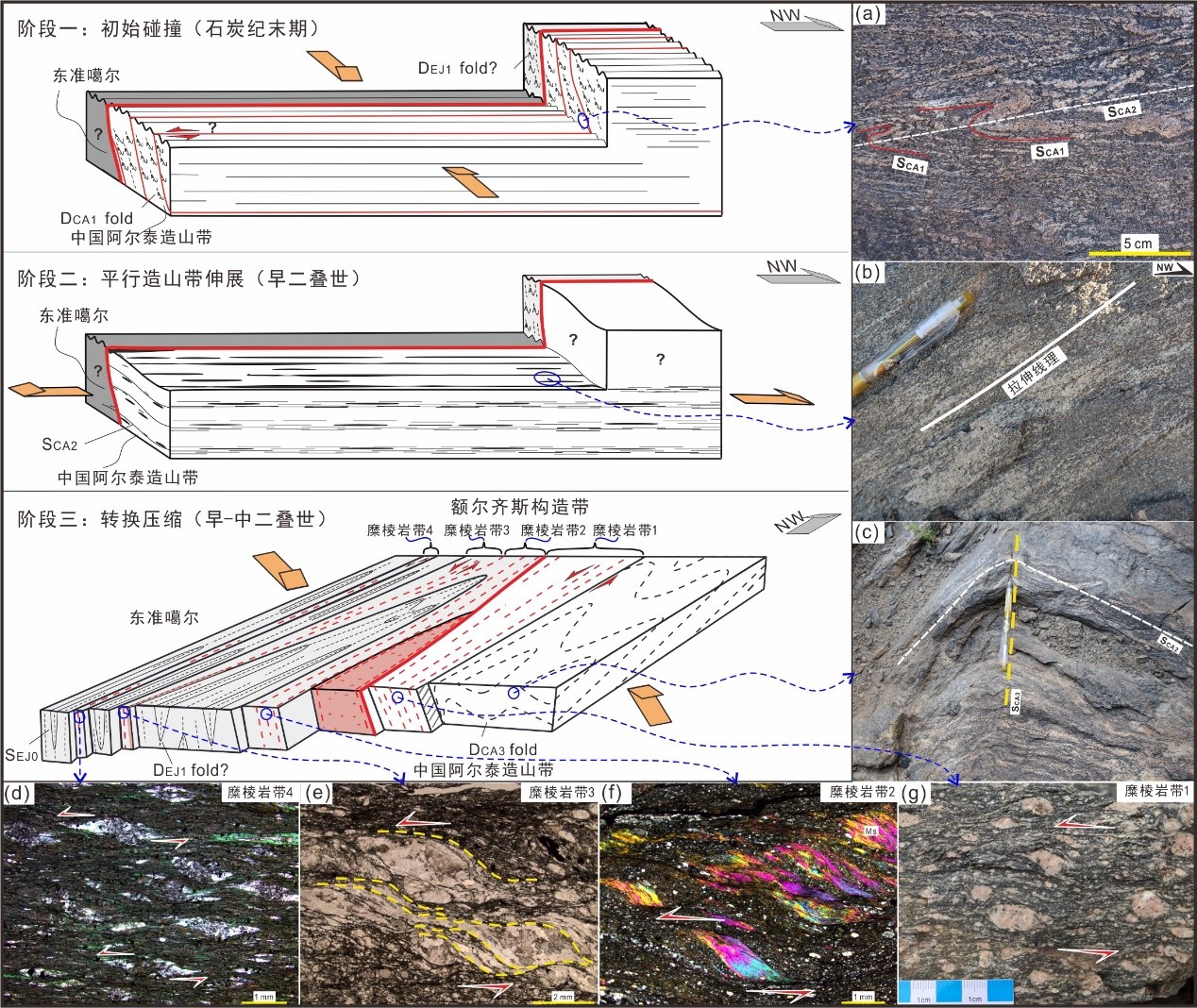 階段三:早-中二疊世,額爾齊斯構造帶以壓扭性變形為主,產出一系列NW-SE向褶皺構造(DCA3)及與之近平行的左行走滑糜棱巖帶,顯示阿爾泰造山帶與東準噶爾之間以斜向匯聚為特征。