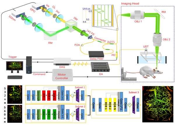 上方為光聲成像系統示意圖,下方由左到右依次為雙波長輸入圖像、多任務殘差密集網絡框架、和卷積神經網絡輸出圖像。