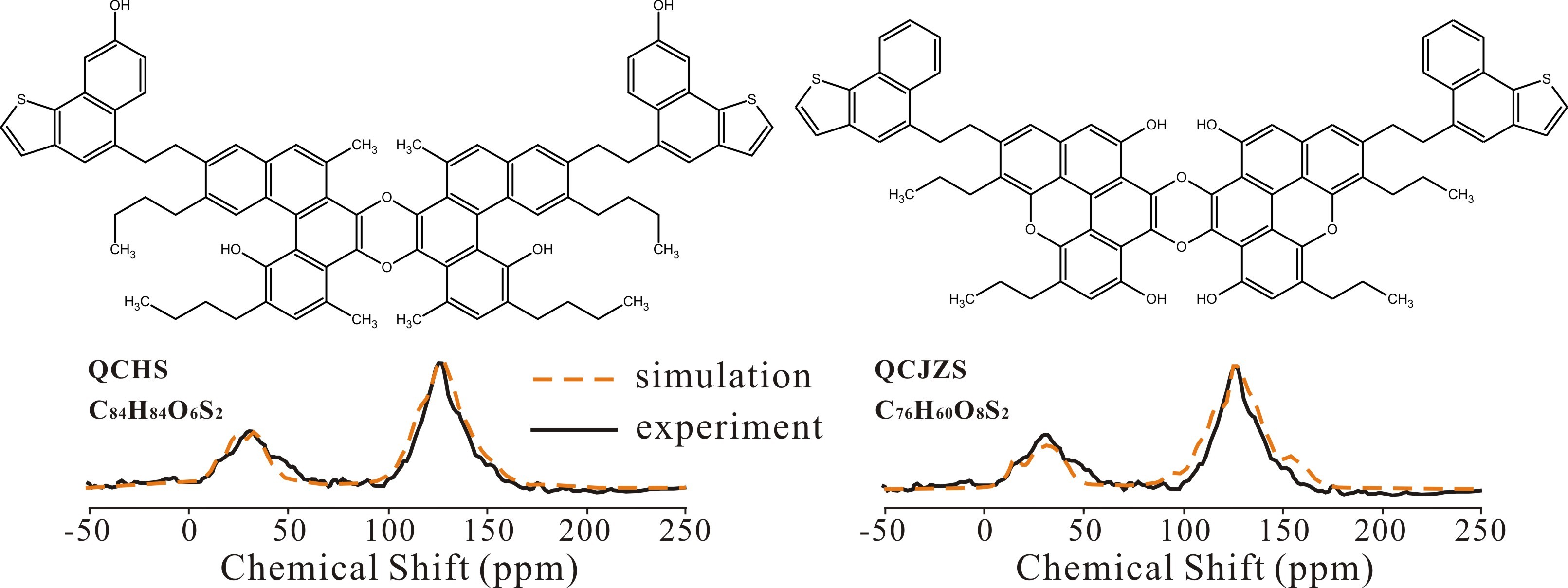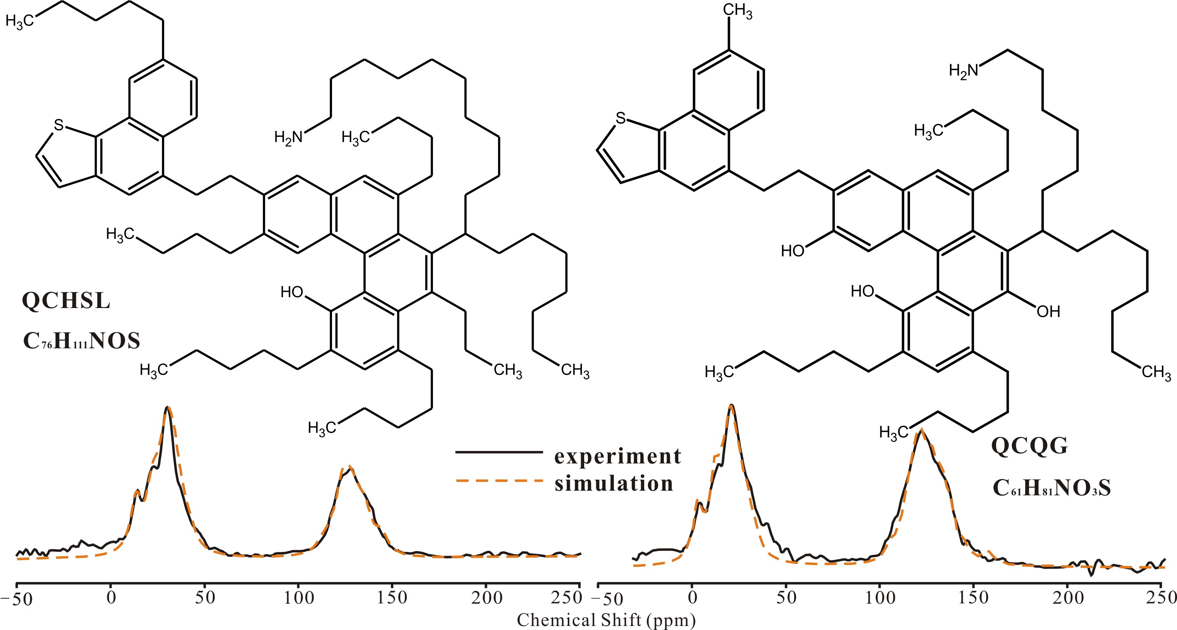 此次研究中共建立四個天然固體瀝青分子模型,如圖1所示,青川火石嶺(QCHSL),青川青溝(QCQG)兩個樣品脂碳含量較高,為高生烴潛力瀝青,而青川黃沙(QCHS)及青川金子山(QCJZS)兩個樣品芳碳含量較高,生烴潛力較低。上述結果可以用于瀝青生烴能力的評價,這為后續開展該地區瀝青二次生烴及資源評價提供了新的思路。