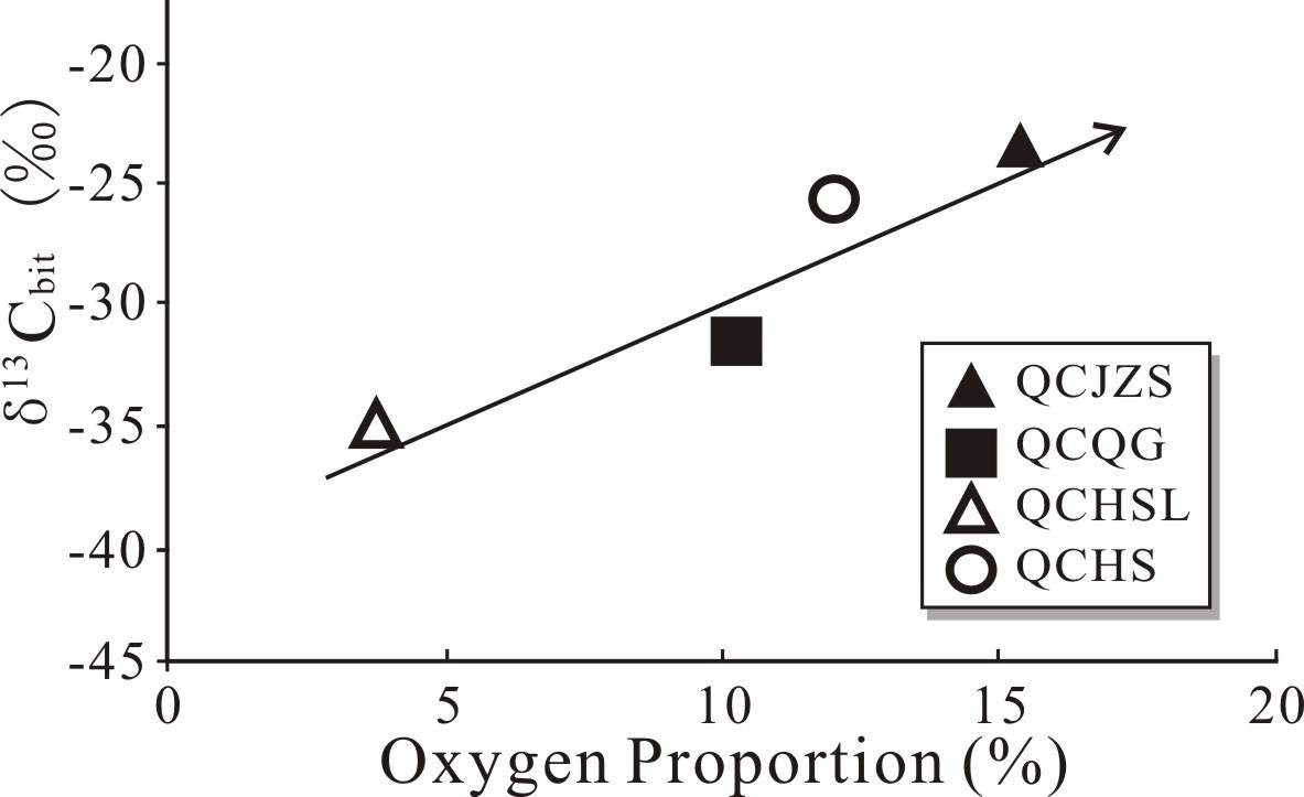 此外,研究還發現,四個不同成熟度的天然固體瀝青結構之間存在演化關系,并且通過碳同位素分析發現,固體瀝青在形成過程中,氧化作用可導致碳同位素發生分餾,如圖2所示,瀝青結構中氧元素的含量與碳同位素呈較好的相關關系。上述研究表明,碳同位素在天然固體瀝青溯源工作中會出現一定偏差,而化學結構和氧元素含量決定了用固體瀝青碳同位素溯源的可靠性。此次研究中如果以青川火石嶺樣品為原樣,可以看出四個固體瀝青都發生了不同程度的氧化作用,從結構演化的角度并結合相關同位素數據認為,該區域的固體瀝青更有可能源自于寒武系烴源巖, 這為該區域長期討論的油氣來源問題提出了新的依據。
