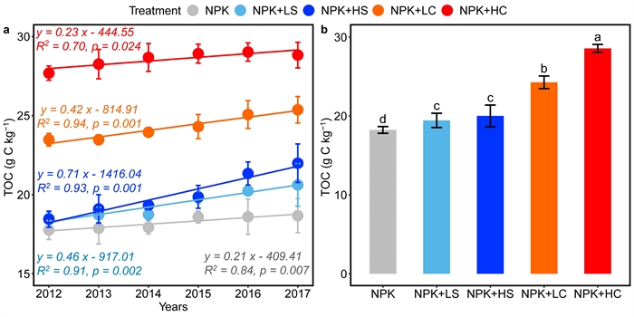 秸稈還田及秸稈源生物質炭施用下6年中土壤總有機碳含量變化
