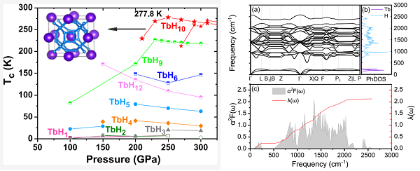 圖:TbH10-Fm3m晶體結構及Tb-H化合物超導轉變溫度(左)和TbH10-Fm3m聲子譜、聲子態密度、 Eliashberg 譜函數α2F (ω)和電聲耦合強度積分(右)