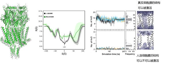 本工作首次在真實細胞膜環(huán)境下解析出5-HT3受體的三維精細冷凍電鏡結構(PDB:6Y5A)。其主鏈的RMSD與人造細胞膜環(huán)境下解析的結構差異高達33埃;離子通道半徑差異高達5埃。通過生理狀態(tài)環(huán)境下的全原子分子動力學模擬發(fā)現(xiàn),在人造細胞膜環(huán)境下解析的結構與激動劑結合后,不能激活5-HT3受體形成連續(xù)水分子通路,不能激活5-HT3受體行使生理功能和信號轉導。而本團隊在真實細胞膜環(huán)境下所解析的結構在相同條件下可以正常激活5-HT3離子通道并行使正常的信號轉導。