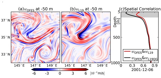 研究團隊曾在2019年提出一個先進的次表層反演方法(L19; Liu et al. 2019),此方法利用海面高度和海面密度可以對上層(~1000米)海洋的(水平)速度場和密度場很好地實現反演。研究團隊把此方法與非絕熱地轉Omega方程結合,利用高分辨率海洋模式資料(1/30°逐日數據)在黑潮延伸體海域計算w,并得到了令人鼓舞的結果:診斷w與模式w相關系數在混合層底與1000米深度之間為0.51-0.67、在混合層中相關系數為0.42-0.51。本工作的亮點之一是:在混合層中,考慮湍流對w的顯著影響,在(地轉絕熱)Omega方程中引入一個高度簡化的湍流參數化方案,該方案能很好地改進混合層內w的診斷結果(相關系數改進最高可達0.31)。本研究成果為充分利用即將問世(2022年)的SWOT(Surface Water and Ocean Topography)測高衛星資料開展反演工作打下先行基礎,具有重要的科學意義和應用價值。