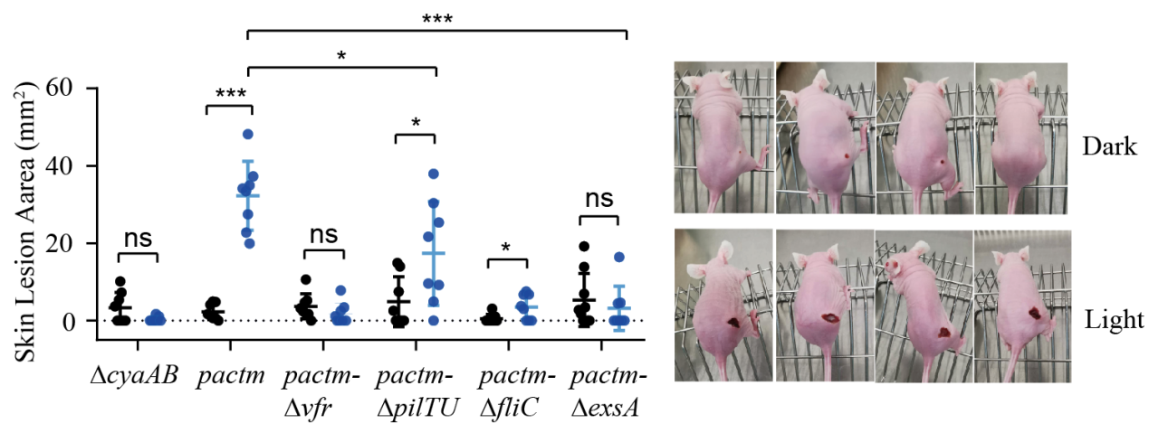 基于以上認識,金帆課題組在銅綠假單胞菌底盤上引入了光敏性的cAMP合成酶,經過一系列改造,構建得到一種工程菌株(命名為pactm)。該工程菌株可以響應藍光的照射而可逆地改變自身蹭行運動的活性以及對宿主的感染能力。在藍光照射下,pactm的cAMP應答啟動子表達量增加了15倍,蹭行運動活性增加了8倍。裸鼠皮下感染模型顯示,藍光照射使pactm感染引起的小鼠皮膚損傷面積增加了14倍,因此這一工作為可控感染實驗模型的構建提供了一個解決方法。此外,作者還通過宏觀的光照模式設計,成功實現了對細菌群體擴張方向的引導,為研究微生物之間的相互作用提供了便利。