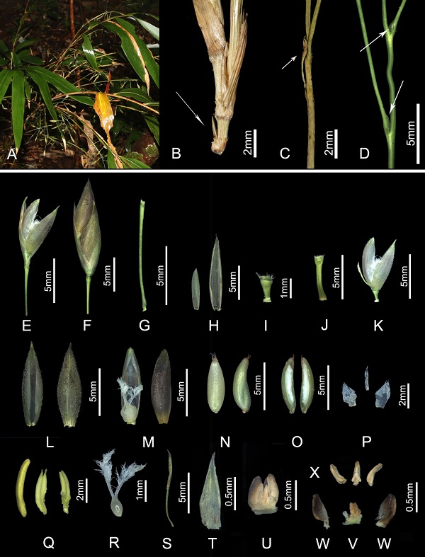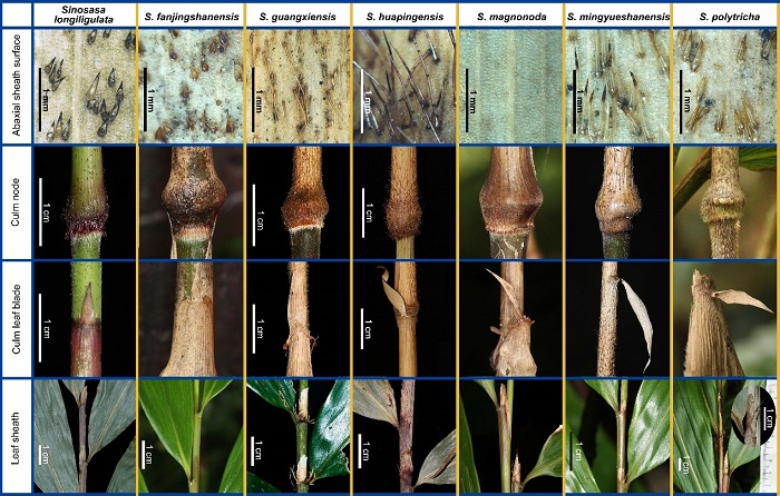 基于以上研究結(jié)果,該團(tuán)隊(duì)便建立了一新屬——華赤竹屬(Sinosasa L.C.Chia ex N.H.Xia, Q.M.Qin & Y.H.Tong, gen. nov.)以放置中國(guó)赤竹屬華赤竹亞屬的成員。通過(guò)全面的標(biāo)本整理和野外考察,團(tuán)隊(duì)成員系統(tǒng)地研究了中國(guó)華赤竹屬的植物,結(jié)果表明該屬目前共有7種,除了先前發(fā)表的3種需要重新組合之外,在該研究中還發(fā)表了四個(gè)新種。該研究解決了中國(guó)赤竹屬赤竹亞屬種類(lèi)的歸屬問(wèn)題,并為將來(lái)青籬竹亞族的全面分類(lèi)修訂工作打下了基礎(chǔ)。